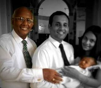 <p>Vijaya with his son-in-law and daughter at the Christening Ceremony of his Grandson, Ravale</p>