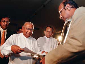 Vijaya Corea being presented the Gold Award at the first ever National Media Awards (May 2008) for yeoman service rendered to uplift the national media in the field of broadcasting. The award is being handed over by then Prime Minister of Sri Lanka, Ratnasiri Wickramanayake with Minister of Mass Media and Information, Anura Priyadharshana Yapa and Minister Lakshman Yapa Abeywardane also associated with the presentation (Source: The Sunday Times, May 25, 2008)